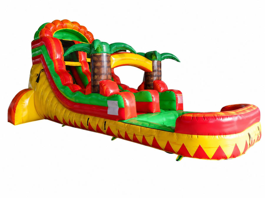 Our Inferno Water Slide brings bold, fire-inspired colors together with tropical palm accents for a setup that instantly stands out. The bright red, yellow, and green design gives it that hot, eye-catching look that grabs attention the moment it’s set up.